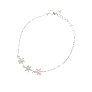 Subtelna, łańcuszkowa bransoletka z ażurowymi elementami co z pewnością dodaje biżuterii niesamowitego uroku. Bransoletka wykonana z rodowanego srebra próby 925. Długość 21 cm. Wielkość ażurowego elementu 10 mm, ilość zawieszek – 3.