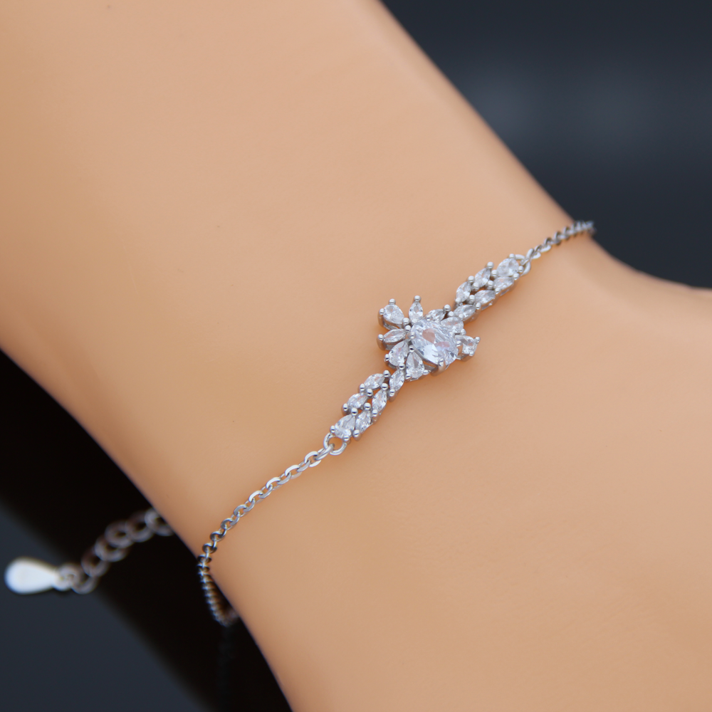 Wyjątkowa, srebrna bransoletka ozdobiona białymi cyrkoniami z łańcuszkowym wykończeniem co z pewnością dodaje jej niesamowitego uroku. Biżuteria wykonana z rodowanego srebra próby 925. Długość regulowana 17 – 19 cm. Wielkość ozdobnego elementu 35 mm x 10 mm.