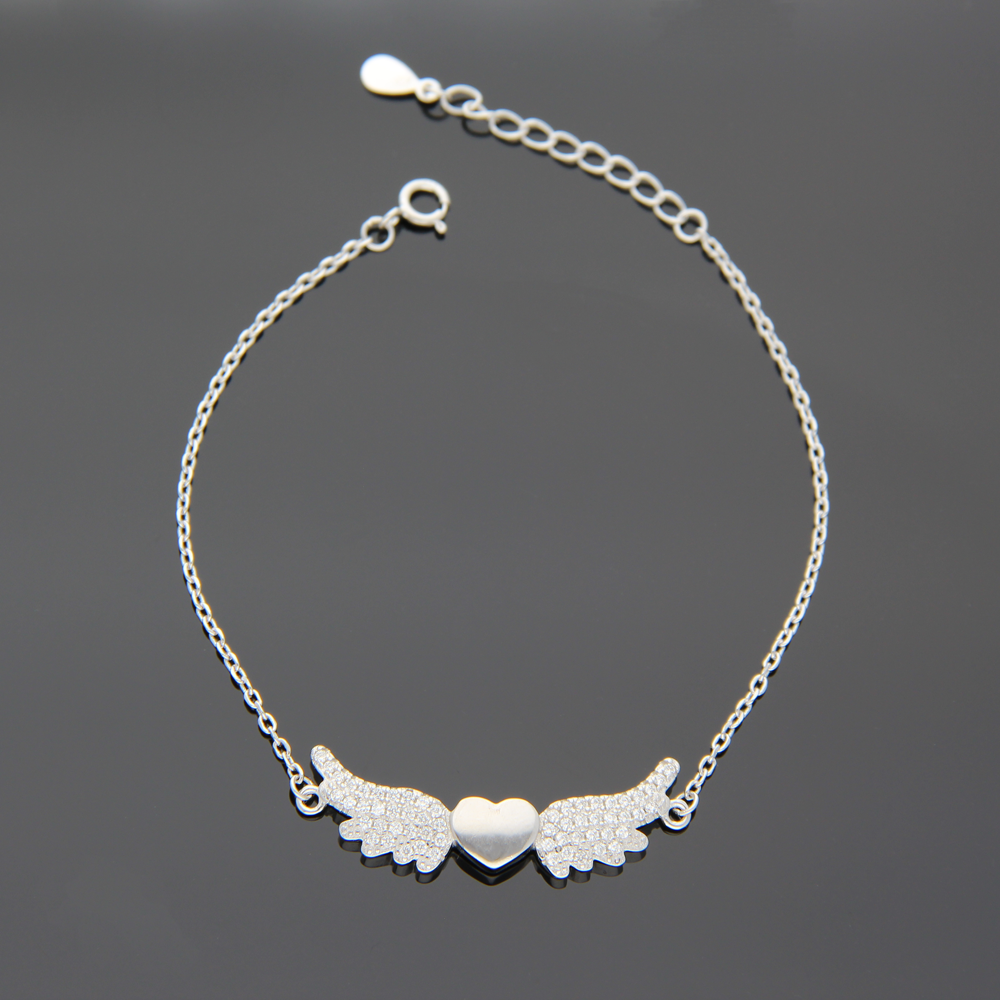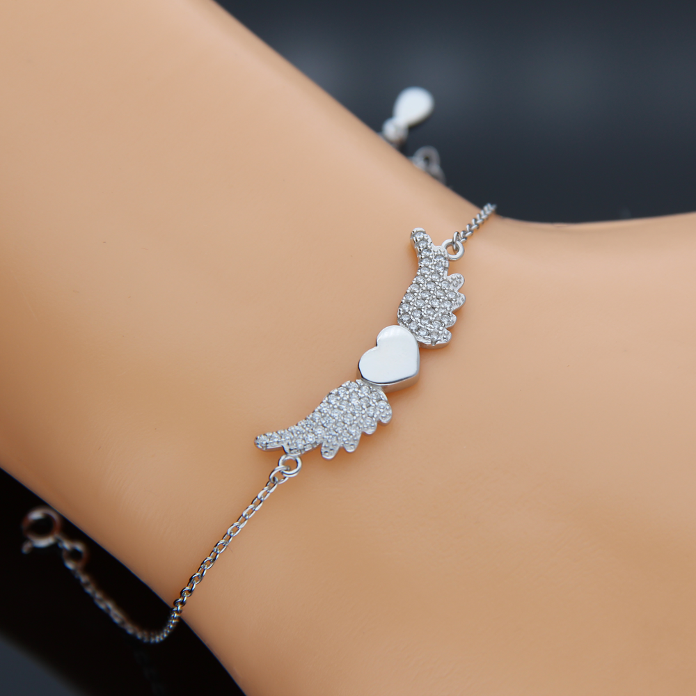 Wyjątkowa, srebrna bransoletka z ozdobnym elementem w kształcie serca ze skrzydłami, ozdobiona białymi cyrkoniami co z pewnością dodaje jej niesamowitego uroku. Biżuteria wykonana z rodowanego srebra próby 925. Długość regulowana 17,5 – 21 cm. Wielkość ozdobnego elementu 33 mm x 10 mm.