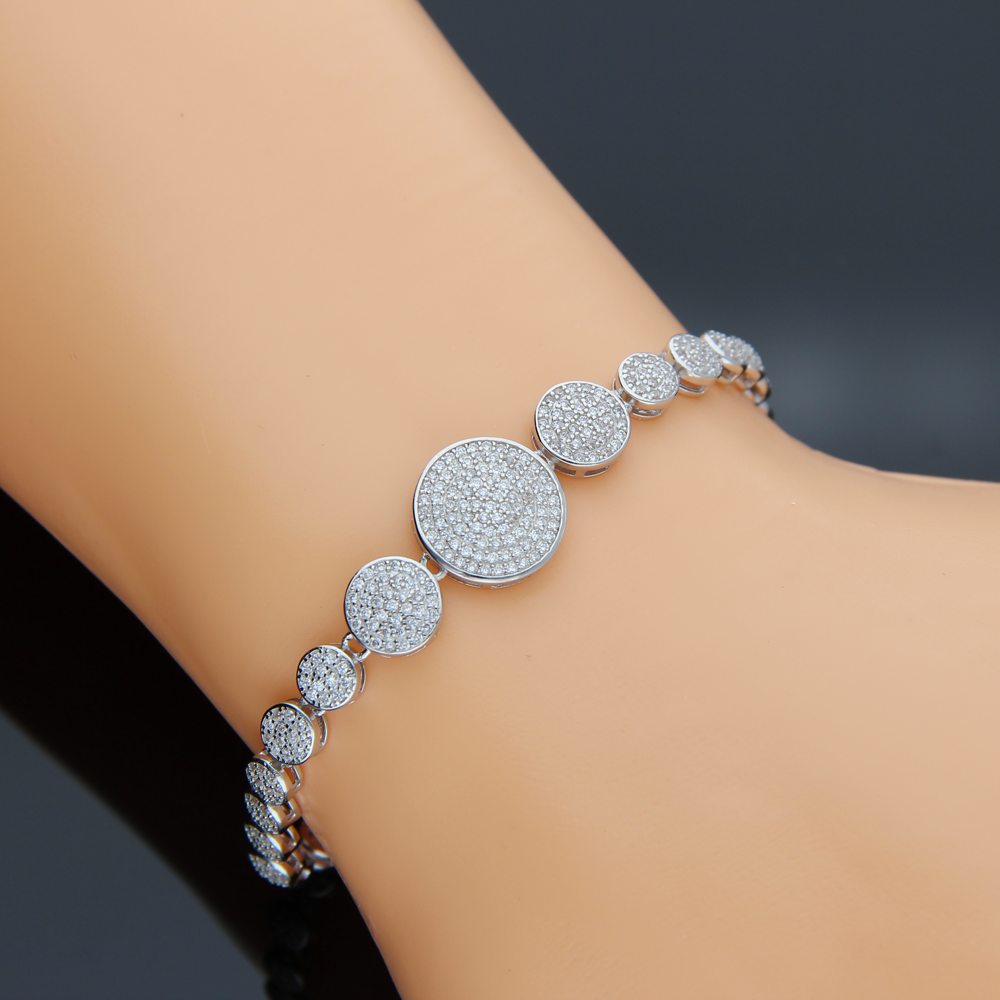 Wyjątkowa, srebrna bransoletka ozdobiona białymi cyrkoniami co z pewnością dodaje jej niesamowitego uroku. Biżuteria wykonana z rodowanego srebra próby 925. Długość 18 cm. Średnica największego kółka – 14 mm, najmniejszego – 5 mm.