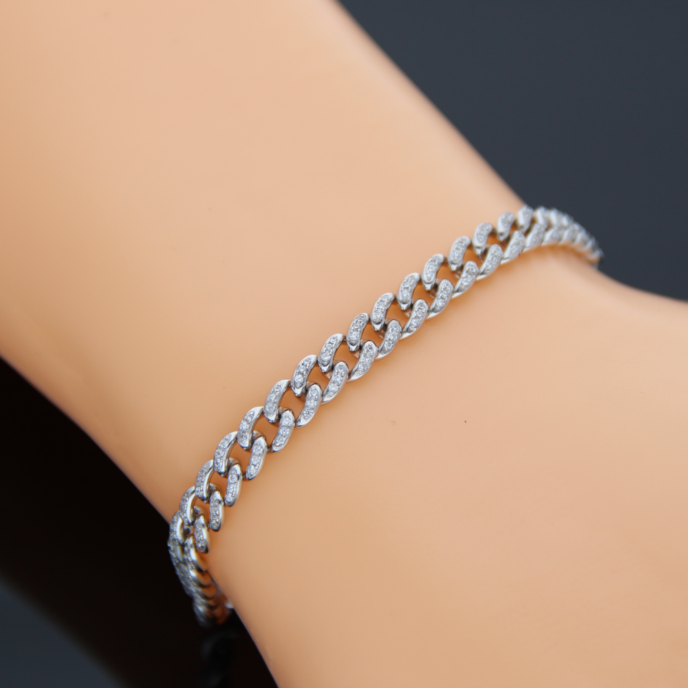 Wyjątkowa, srebrna bransoletka ozdobiona białymi cyrkoniami o splocie pancerki co z pewnością dodaje jej niesamowitego uroku. Biżuteria wykonana z rodowanego srebra próby 925. Długość 18 cm. Szerokość 6 mm.