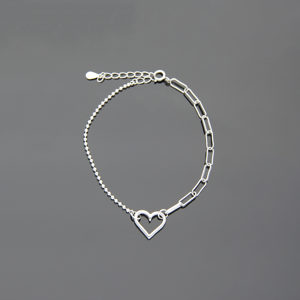 Wyjątkowa, srebrna bransoletka ozdobiona ażurowym sercem oraz dwoma rodzajami łańcuszka co z pewnością dodaje jej niesamowitego uroku. Biżuteria wykonana z rodowanego srebra próby 925. Długość regulowana 16 – 19 cm. Wielkość serca 11 mm x 12 mm.
