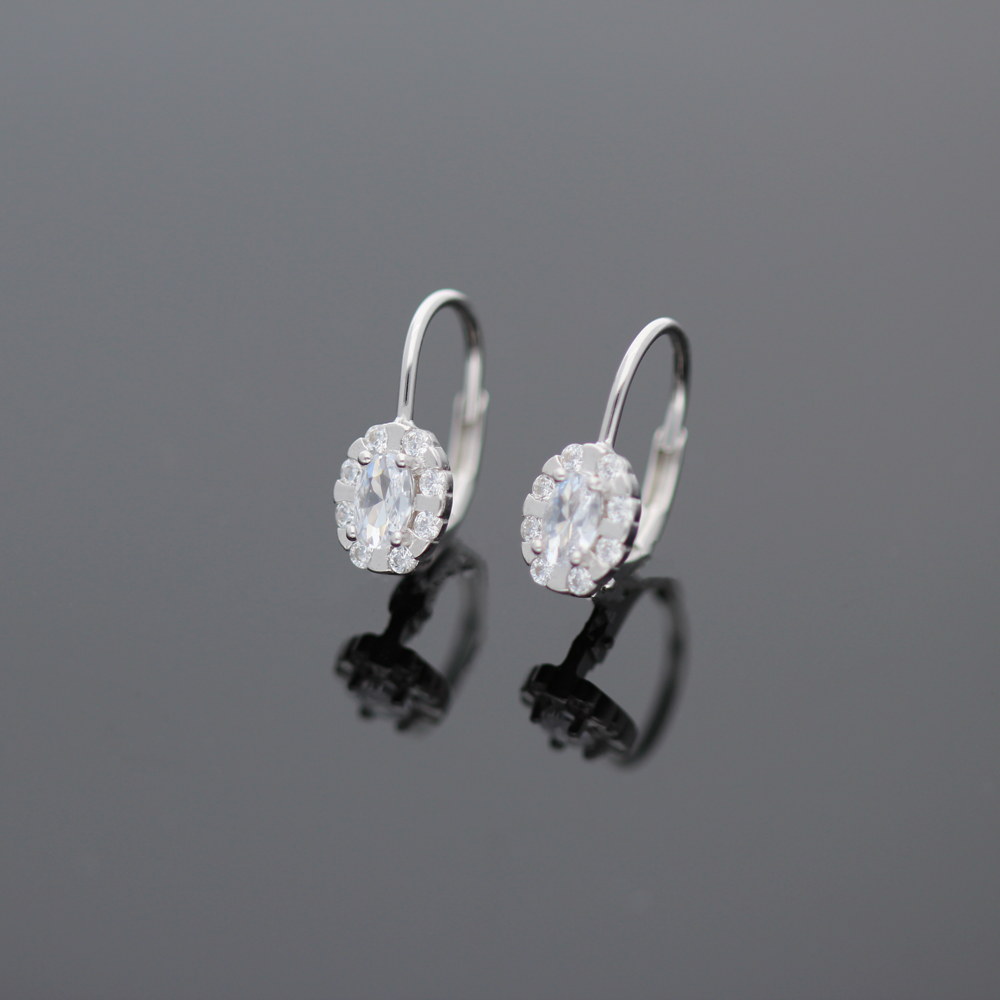 Wyjątkowe, srebrne kolczyki na angielskim zapięciu z pięknie mieniącymi się białymi cyrkoniami co z pewnością dodaje biżuterii niepowtarzalnego uroku. Całość wykonana z rodowanego srebra próby 925. Wielkość ozdobnego elementu 6 mm x 8 mm.
