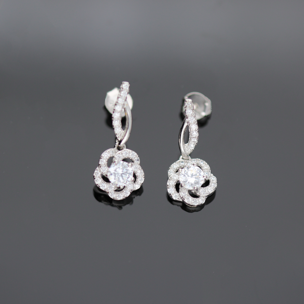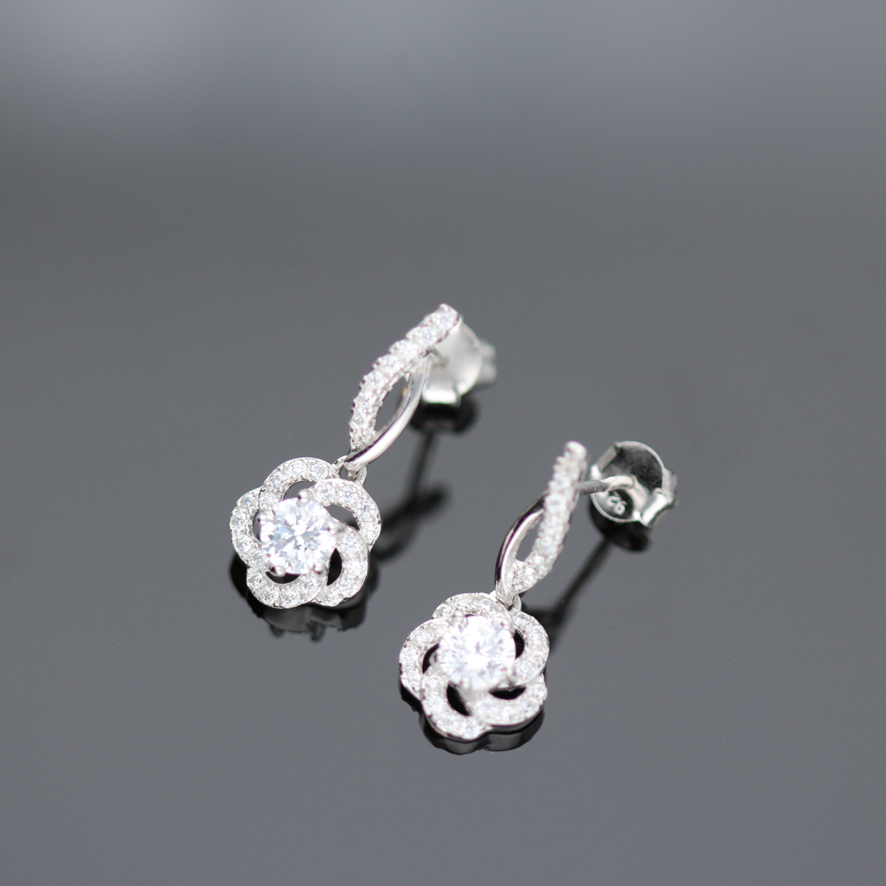 Wyjątkowe, srebrne kolczyki na sztyfcie – kwiatki z pięknie mieniącymi się białymi cyrkoniami co z pewnością dodaje biżuterii niepowtarzalnego uroku. Całość wykonana z rodowanego srebra próby 925. Długość kolczyków 21 mm. Średnica kwiatka 10 mm.