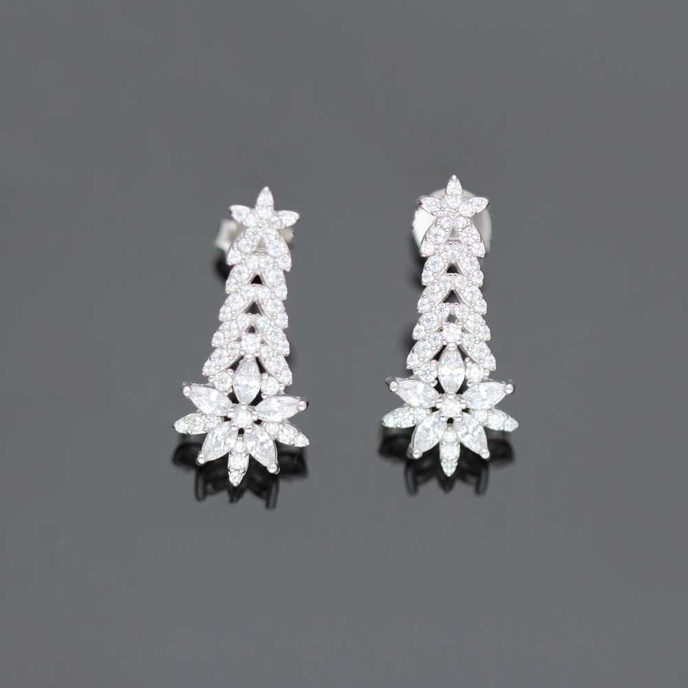 Wyjątkowe, srebrne kolczyki na sztyfcie z pięknie mieniącymi cyrkoniami co z pewnością dodaje biżuterii wyjątkowego uroku. Całość wykonana z rodowanego srebra próby 925. Długość kolczyków 23 mm, szerokość 5-10 mm.