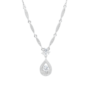 Przepiękny naszyjnik o długości 50 cm, bogato wysadzany cyrkoniami co z pewnością dodaje biżuterii niepowtarzalnego uroku. Wykonany z rodowanego srebra próby 925. Wielkość ozdobnego elementu: szerokość 50mm, wysokość 40 mm.