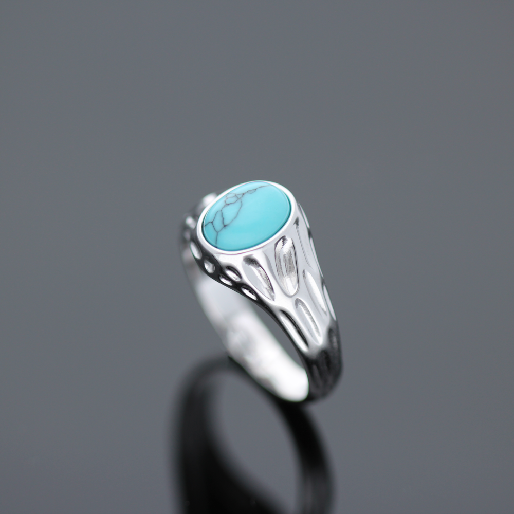 Klasyczny, srebrny pierścionek z pięknie osadzonym kamieniem syntetycznym w kolorze turkusowym co z pewnością dodaje biżuterii niesamowitego uroku. Całość wykonana z rodowanego srebra próby 925.  Szerokość obrączki 3 mm. Wielkość kamienia 10 mm x 7 mm.