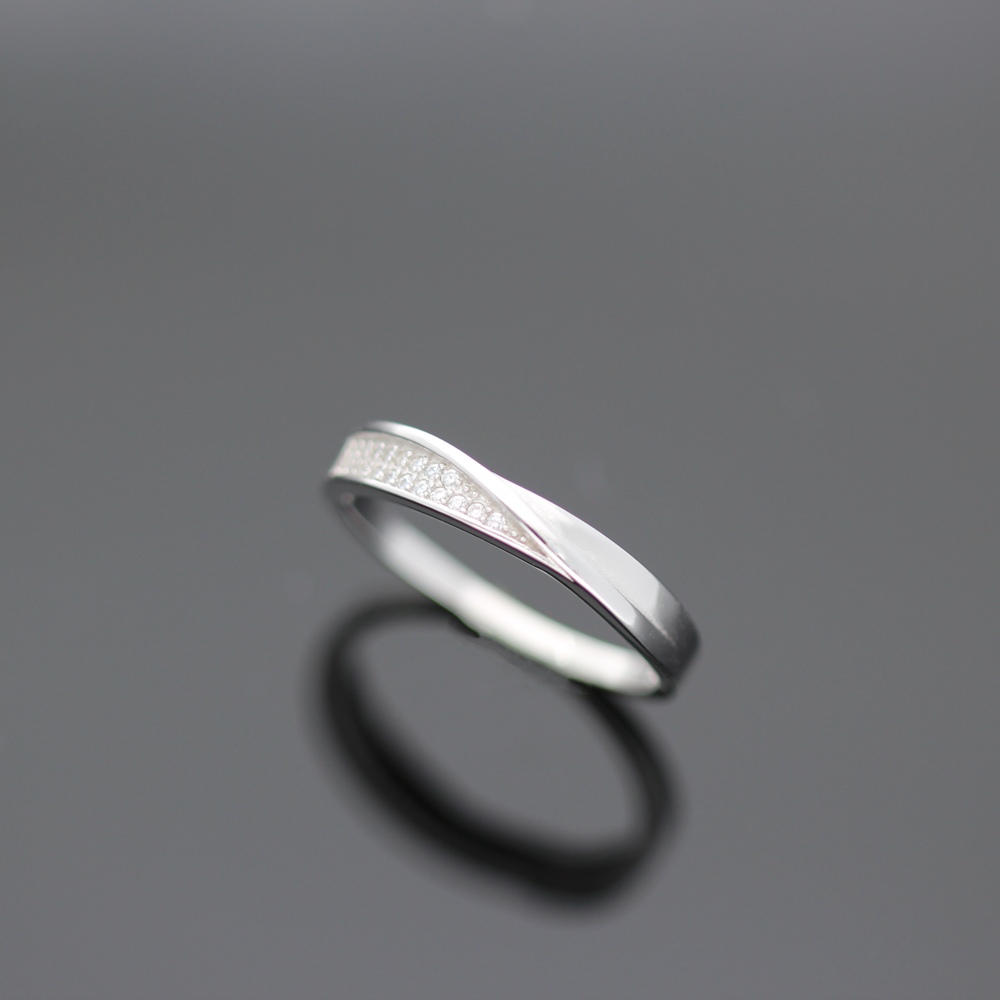 Obrączkowy, srebrny pierścionek wysadzany pięknie mieniącymi się białymi cyrkoniami co z pewnością dodaje biżuterii niesamowitego uroku. Całość wykonana z rodowanego srebra próby 925. Szerokość obrączki 3 mm.
