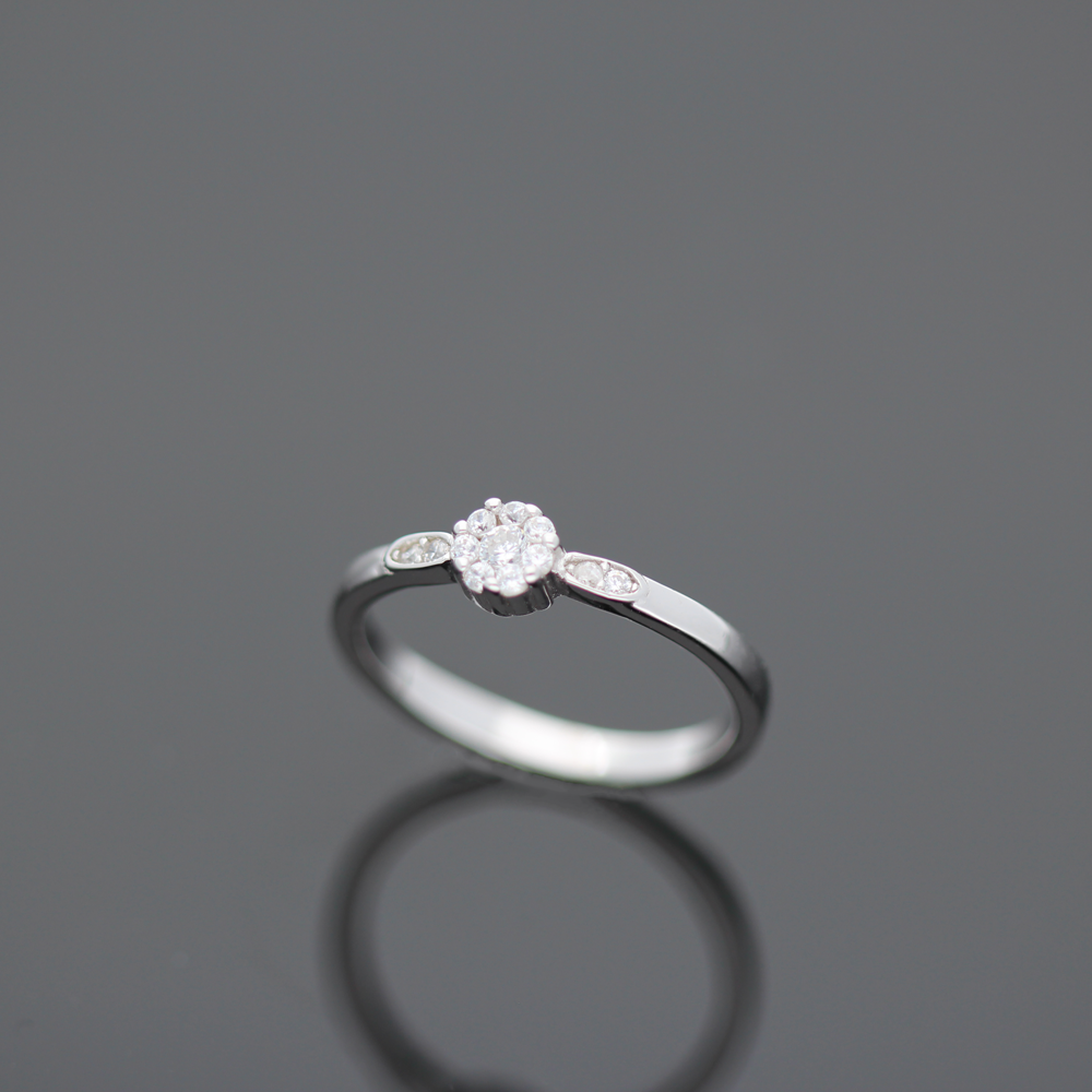 Delikatny, srebrny pierścionek z przepięknie mieniącym się cyrkoniami, które tworzą element kwiatowy co z pewnością dodaje biżuterii niesamowitego uroku. Całość wykonana z rodowanego srebra próby 925. Wielkość ozdobnego elementu 5 mm
