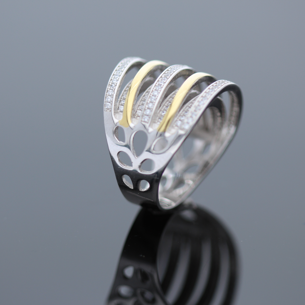 Wyjątkowo ozdobny, srebrny pierścionek z przepięknie mieniącymi się cyrkoniami co z pewnością dodaje biżuterii niesamowitego uroku. Całość wykonana z rodowanego oraz złoconego srebra próby 925. Szerokość pierścionka 2 cm. Wysokość 0,5 cm