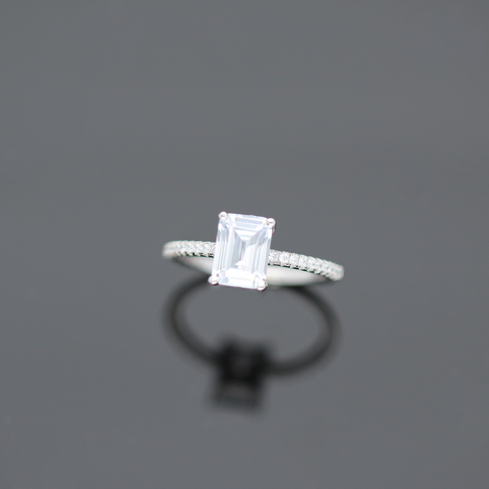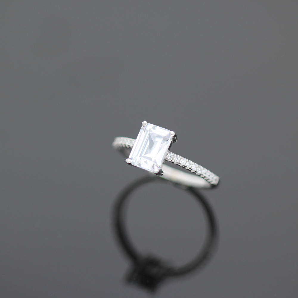 Delikatny, srebrny pierścionek w całości wysadzany przepięknie mieniącymi się cyrkoniami co z pewnością dodaje biżuterii niesamowitego uroku. Całość wykonana z rodowanego srebra próby 925.  Szerokość obrączki 1 mm wielkość kamienia 8 mm x 6 mm.