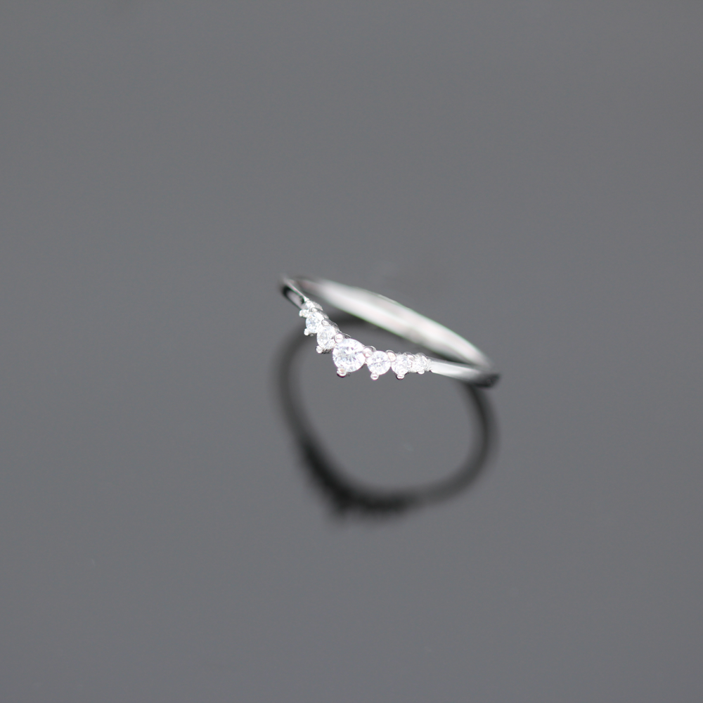 Delikatny, srebrny pierścionek w całości wysadzany przepięknie mieniącymi się cyrkoniami co z pewnością dodaje biżuterii niesamowitego uroku. Całość wykonana z rodowanego srebra próby 925. Szerokość obrączki 1 mm. Wielkość ozdobnego elementu 1 mm x 12 mm