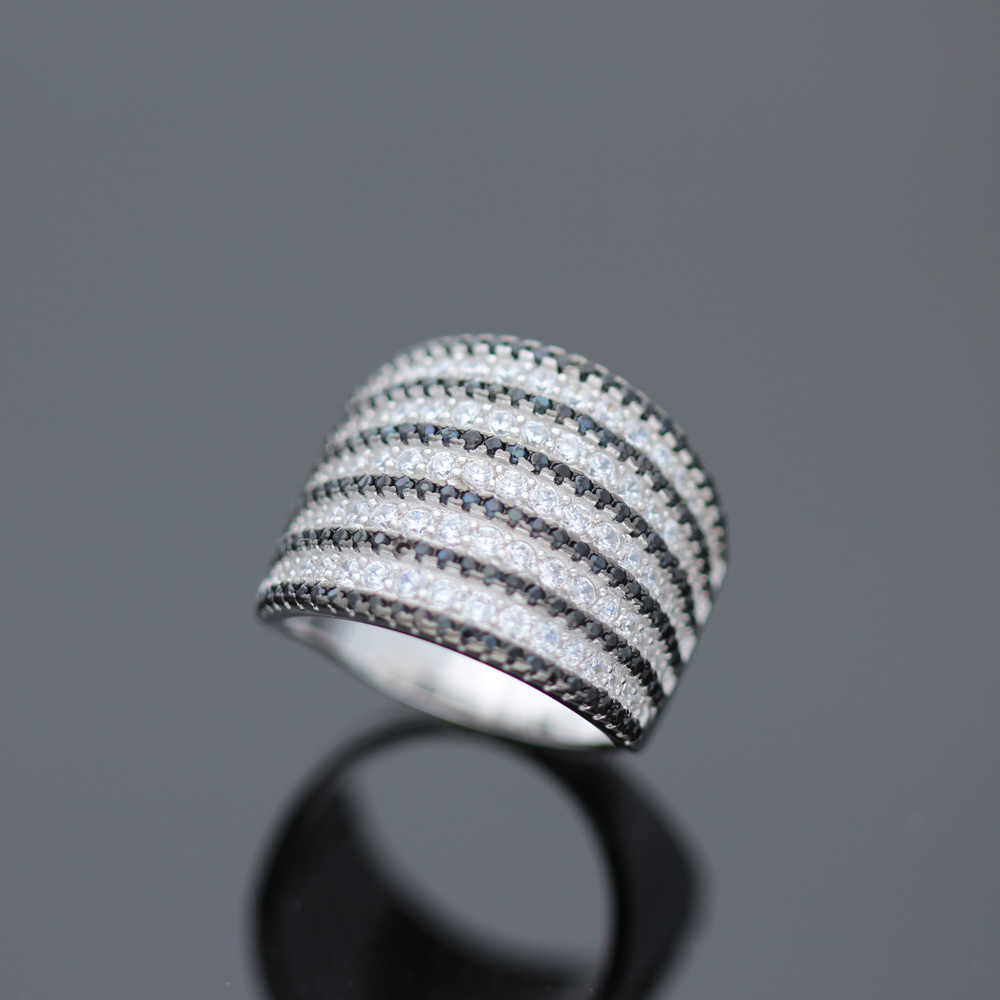 Wyjątkowy, srebrny pierścionek z przepięknie mieniącymi się białymi i czarnymi cyrkoniami co z pewnością dodaje biżuterii niesamowitego uroku. Całość wykonana z rodowanego srebra próby 925. Szerokość pierścionka 18 mm. Szerokość obrączki 4 mm.