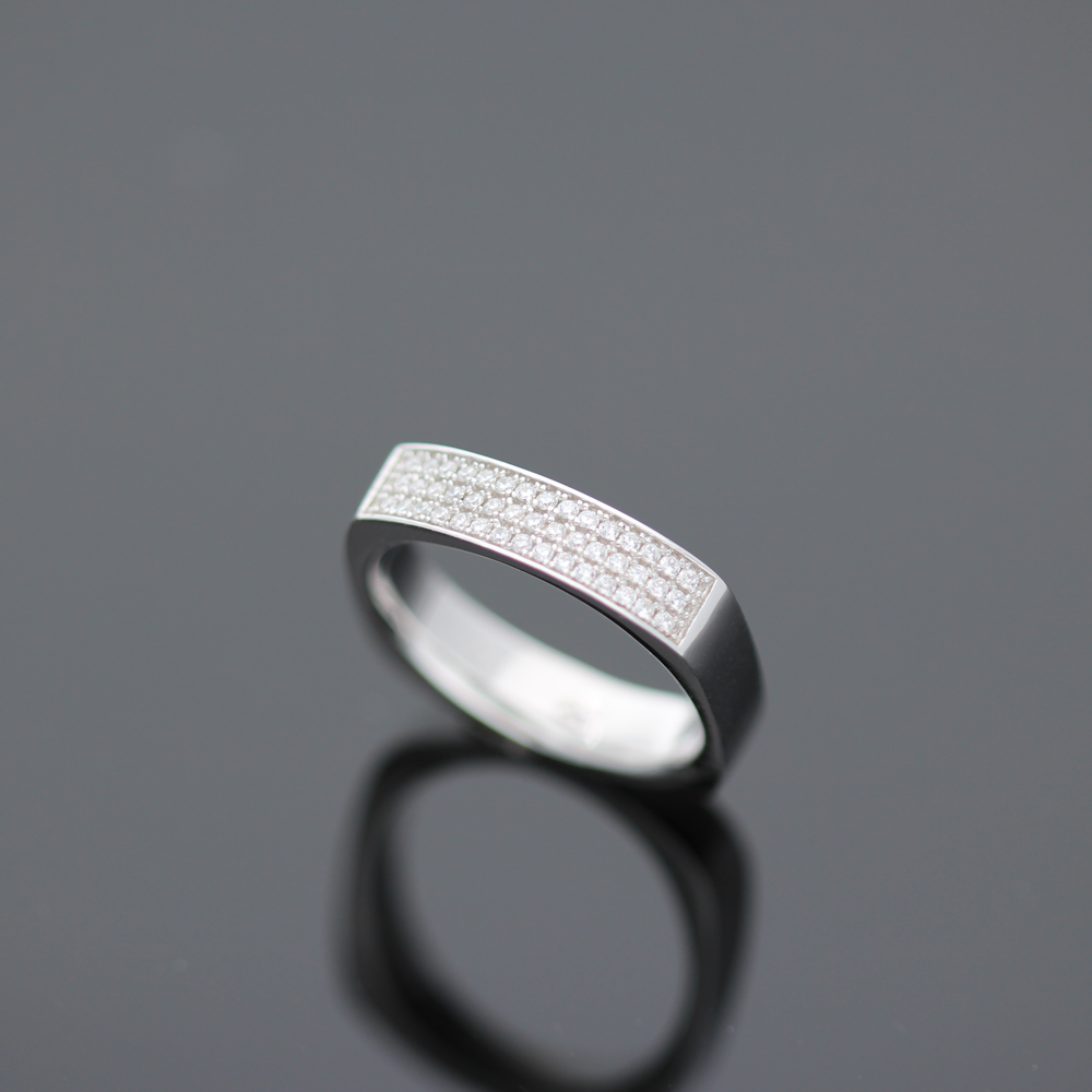 Obrączkowy, srebrny pierścionek wysadzany przepięknie mieniącymi się białymi cyrkoniami co z pewnością dodaje biżuterii niesamowitego uroku. Całość wykonana z rodowanego srebra próby 925. Szerokość pierścionka 5 mm.