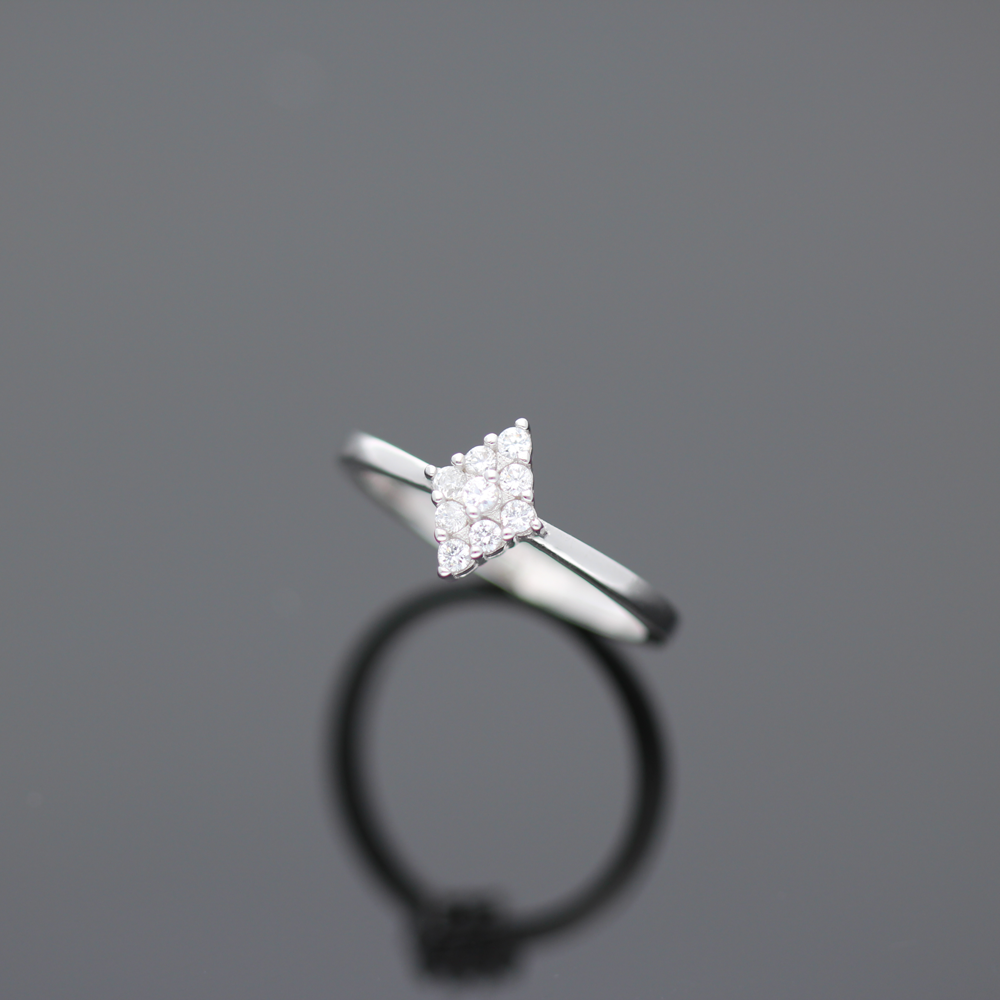 Klasyczny, srebrny pierścionek wysadzany przepięknie mieniącymi się białymi cyrkoniami co z pewnością dodaje biżuterii niesamowitego uroku. Całość wykonana z rodowanego srebra próby 925. Wielkość ozdobnego elementu 9 mm x 6 mm. Szerokość obrączki 2 mm.