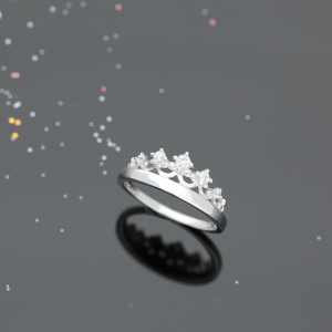 Wyjątkowy, srebrny pierścionek z elementem ozdobnym w kształcie korony, bogato wysadzany drobnymi cyrkoniami co z pewnością dodaje biżuterii niesamowitego uroku. Całość wykonana z rodowanego srebra próby 925. Szerokość pierścionka 7 mm.