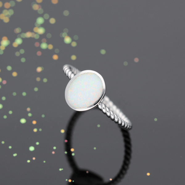 Delikatny, srebrny pierścionek z opalem syntetycznym z pewnością dodaje biżuterii niesamowitego uroku. Całość wykonana z rodowanego srebra próby 925. Średnica kamienia 7 mm.