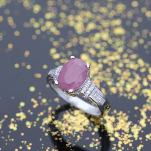Uroczy, srebrny pierścionek wysadzany pięknie mieniącym się naturalnym rubinem oraz cyrkoniami co z pewnością dodaje biżuterii niesamowitego uroku. Całość wykonana z rodowanego srebra próby 925. Wielkość kamienia 9 mm x 7 mm.