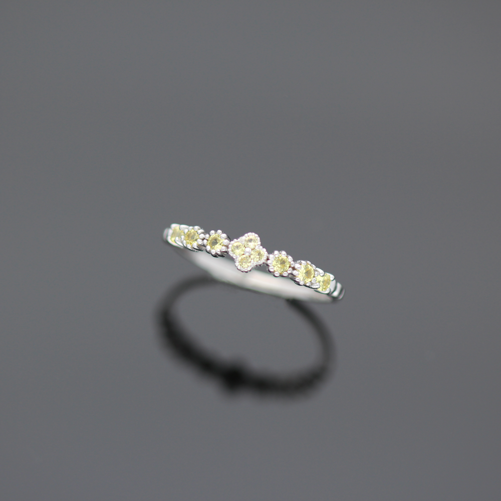 Ponadczasowy, srebrny pierścionek wysadzany pięknie mieniącymi się żółtymi szafirami co z pewnością dodaje biżuterii niesamowitego uroku. Całość wykonana z rodowanego srebra próby 925. Szerokość  ozdobnego elementu 3-4 mm.