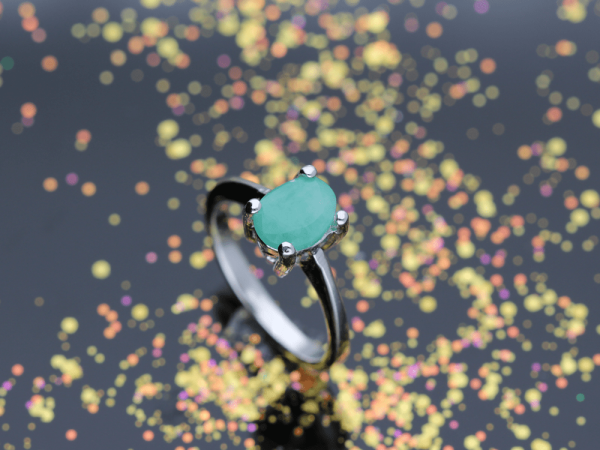 Pierścionek srebrny ozdobiony szmaragdem, szafirem lub rubinem co z pewnością dodaje biżuterii niepowtarzalnego uroku. Całość wykonana z rodowanego srebra próby 925. Wielkość kamienia 8 mm x 7 mm.