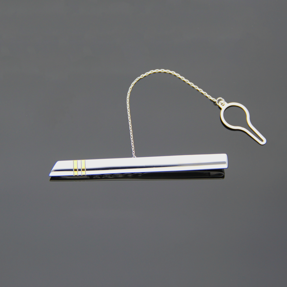 Srebrna spinka do krawata z delikatnymi złoconymi paskami co z pewnością dodaje jej niepowtarzalnego uroku. Całość wykonana z rodowanego srebra próby 925. Długość spinki 65 mm, szerokość 6 mm.