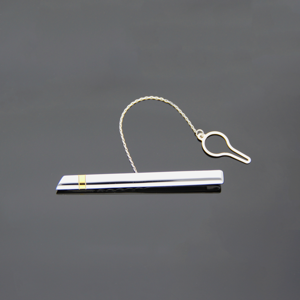 Srebrna spinka do krawata z delikatnym złoconym paskiem co z pewnością dodaje jej niepowtarzalnego uroku. Całość wykonana z rodowanego srebra próby 925. Długość spinki 65 mm, szerokość 6 mm.