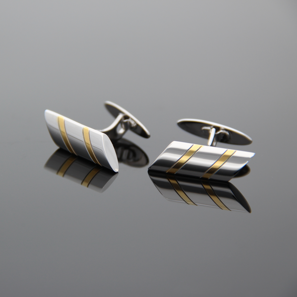 Srebrne spinki do mankietów o kształcie równoległoboku ze złoconymi paskami co z pewnością dodaje im niepowtarzalnego uroku. Całość wykonana z rodowanego srebra próby 925. Wielkość 20 mm x 8 mm.