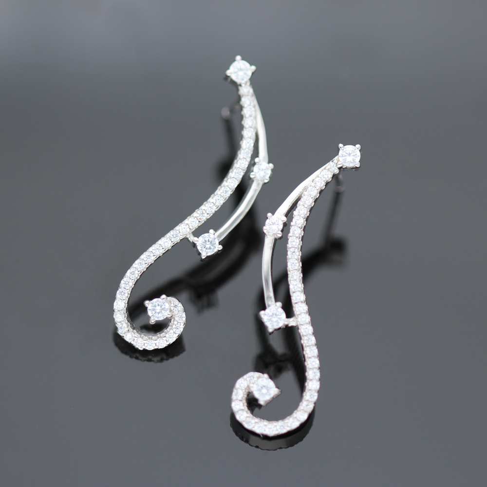 Długie, srebrne kolczyki z pięknie osadzonymi cyrkoniami co dodaje biżuterii niesamowitego uroku. Całość wykonana z rodowanego srebra próby 925. Długość kolczyków 34 mm, szerokość 4 – 10 mm.